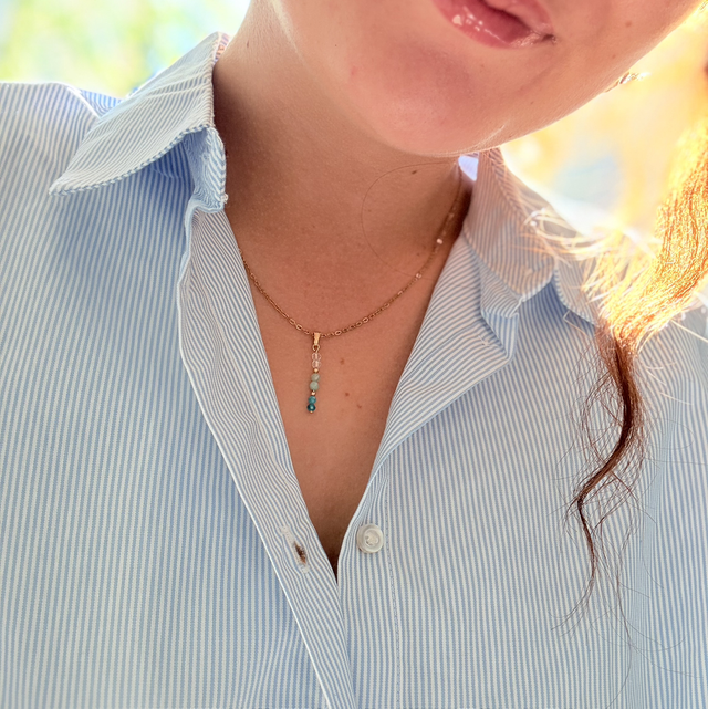 Découvrez ce collier raffiné en acier inoxydable, sublimé par un subtil mélange de cristal, d’amazonite et d’apatite naturelle. Chaque pierre a été soigneusement sélectionnée pour sa couleur unique et son énergie apaisante, offrant un bijou à la fois élégant et porteur de sens.