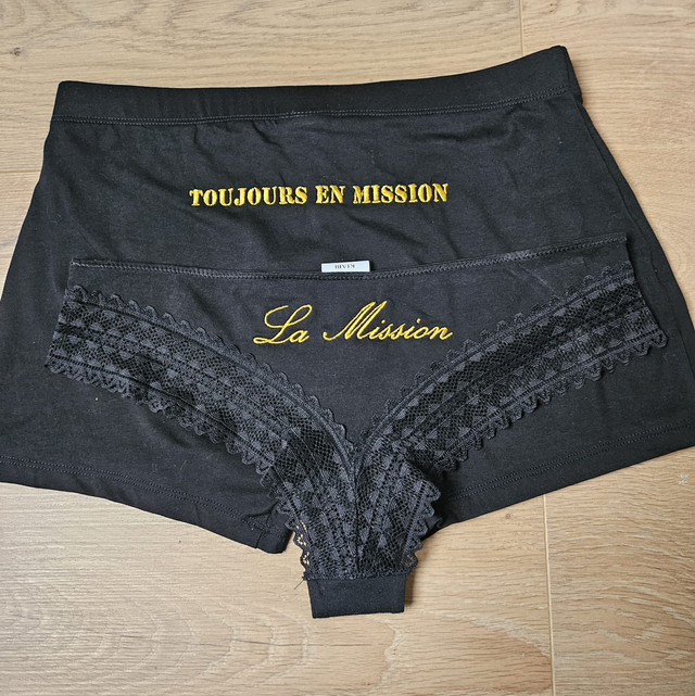Le tanga brodĂ© “La mission” est pensĂ© pour celles qui aiment allier confort, sensualitĂ© et touche d’humour. Sa coupe flatteuse met en valeur les courbes tout en restant agrĂ©able Ă  porter au quotidien.